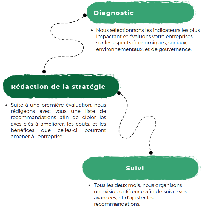 Une stratégie RSE définit les engagements et actions concrètes de votre entreprise en matière de développement durable. Elle structure votre démarche autour d’objectifs environnementaux, sociaux et de gouvernance (ESG), en cohérence avec votre activité, et vos valeurs. Nous utilisons des grilles d’indicateurs reconnues par l’Union européenne (VSME, label “Engagé RSE) pour assurer votre crédibilité auprès des marchés publics et de vos donneurs d’ordres.